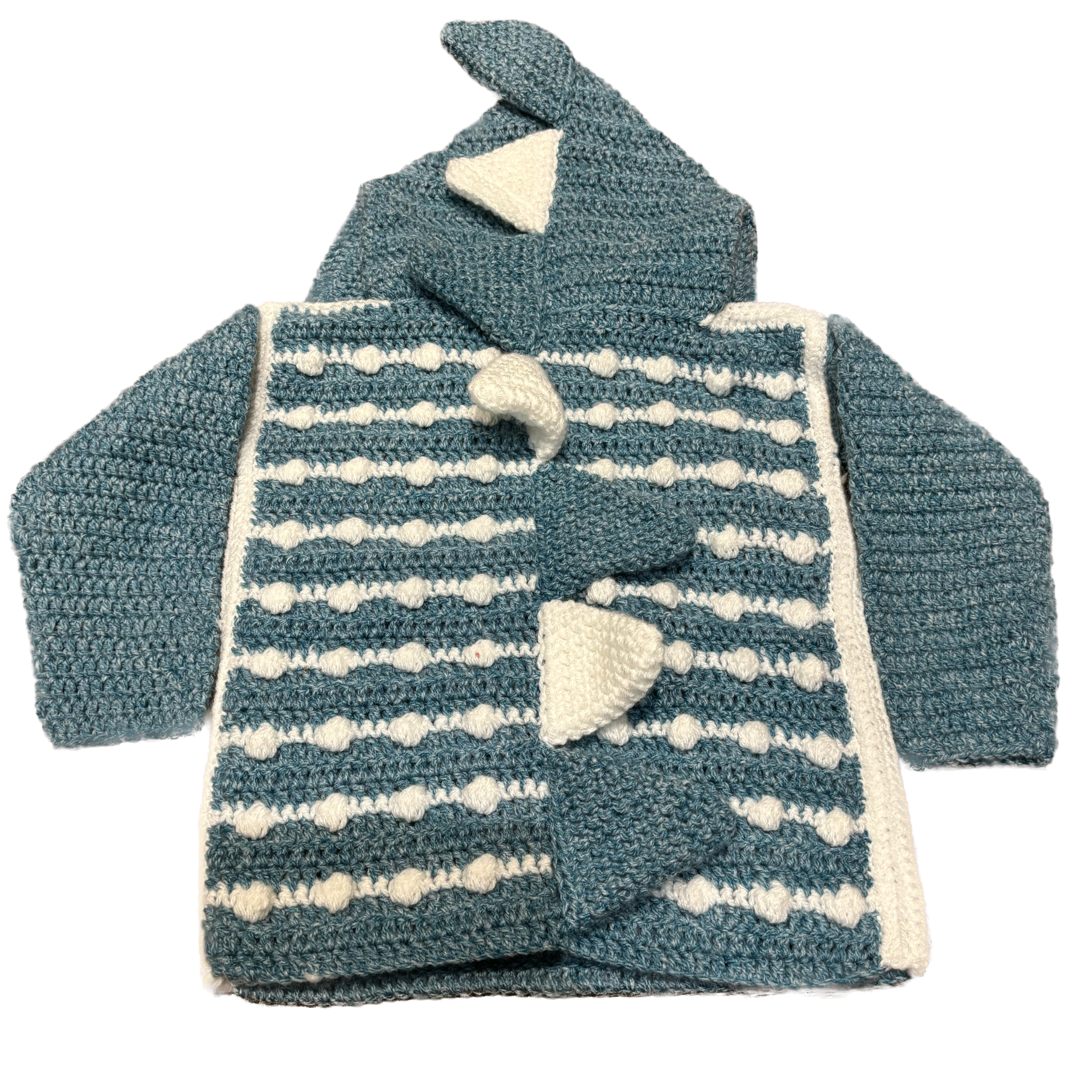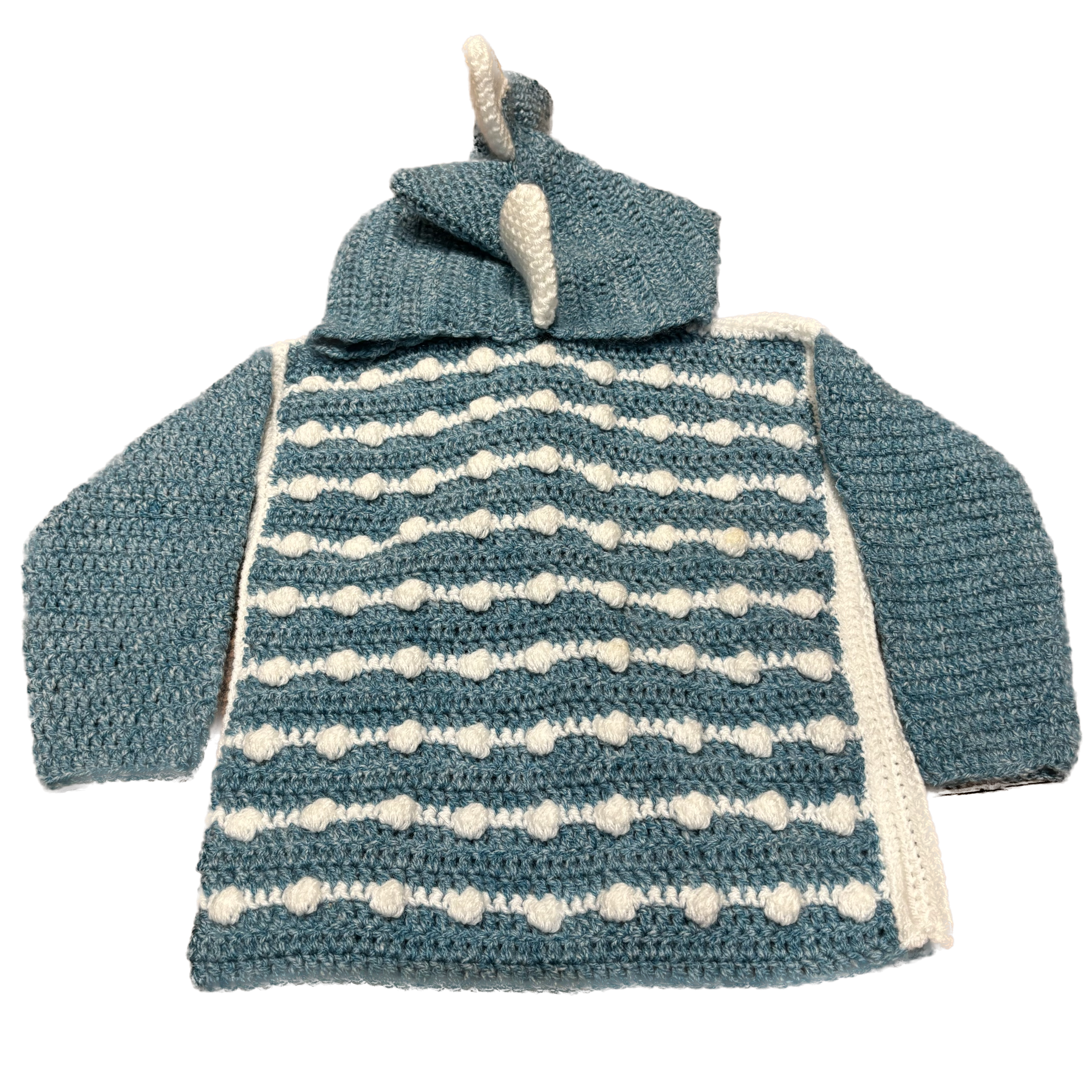 Handmade crocheted dinosaur hoodie for 1 – 2 years old. Made to an original design by Lisa.