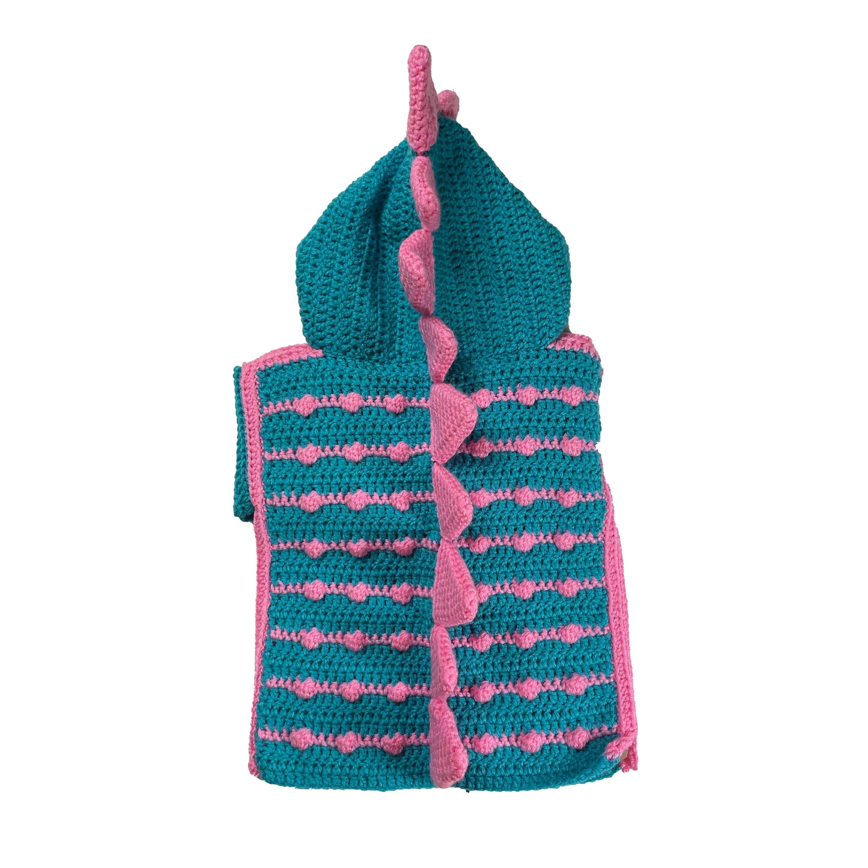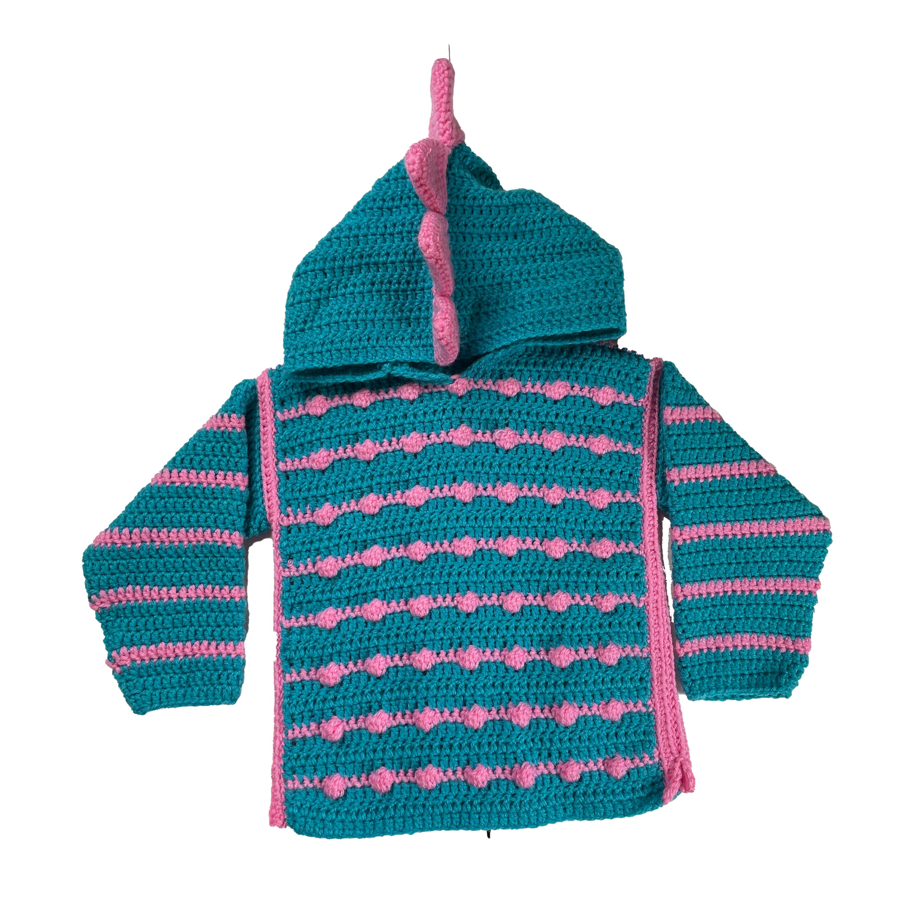 Handmade crocheted dinosaur hoodie for 6 – 12 months old. Made to an original design by Lisa.