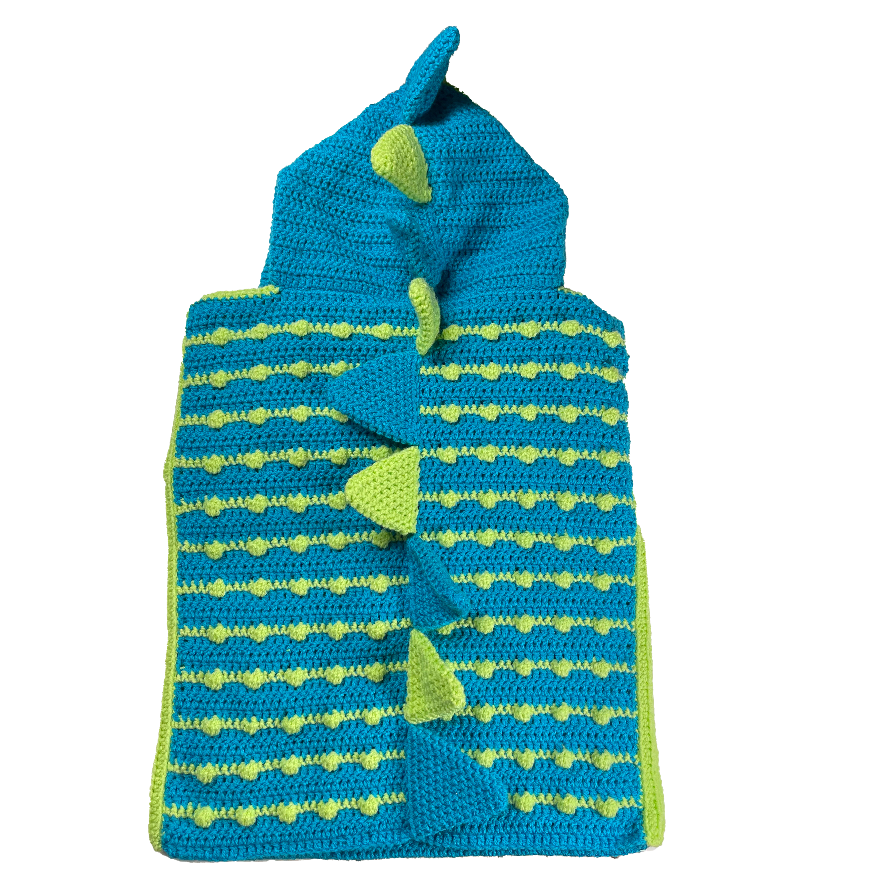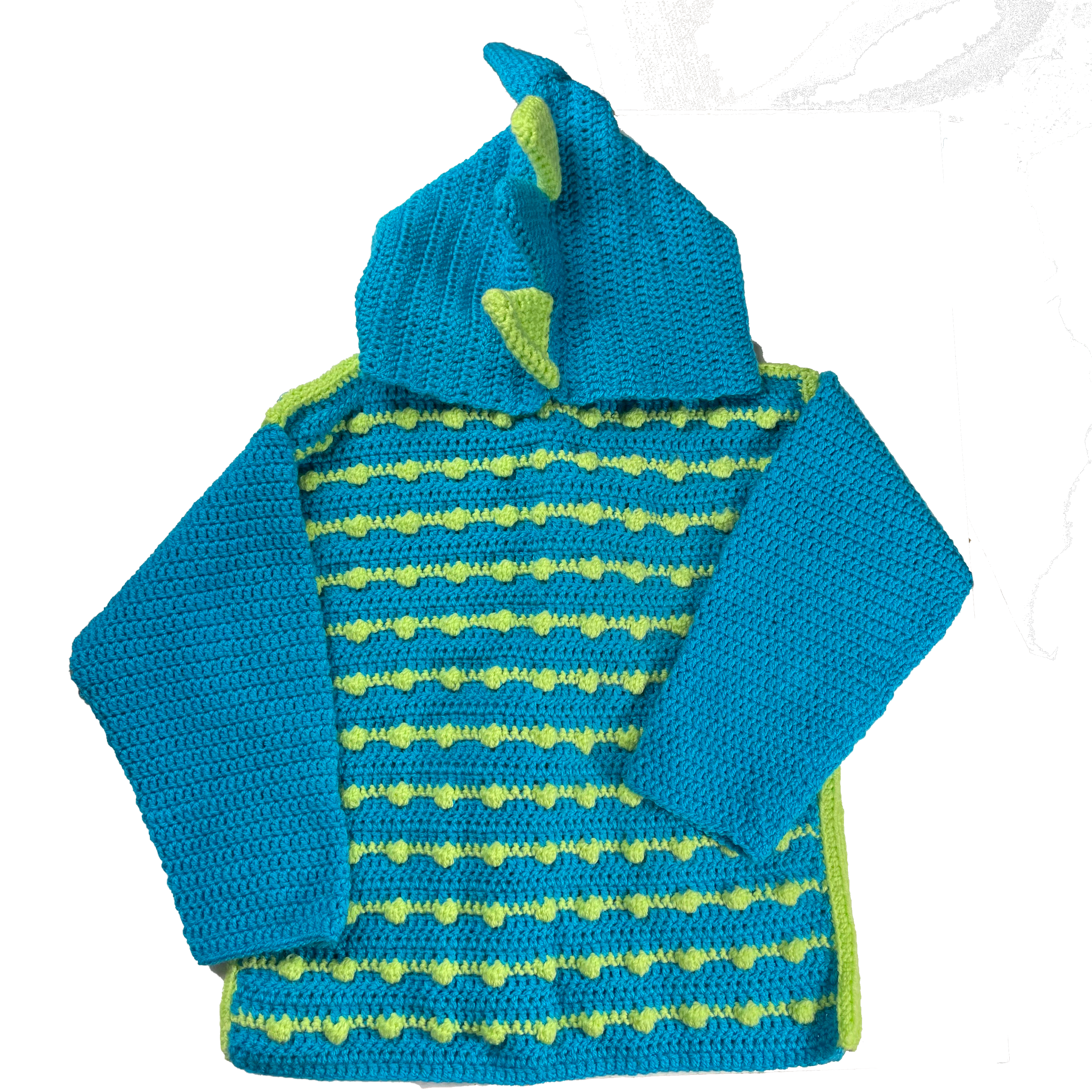 Handmade crocheted dinosaur hoodie for 7 – 8 years old. Made to an original design by Lisa.