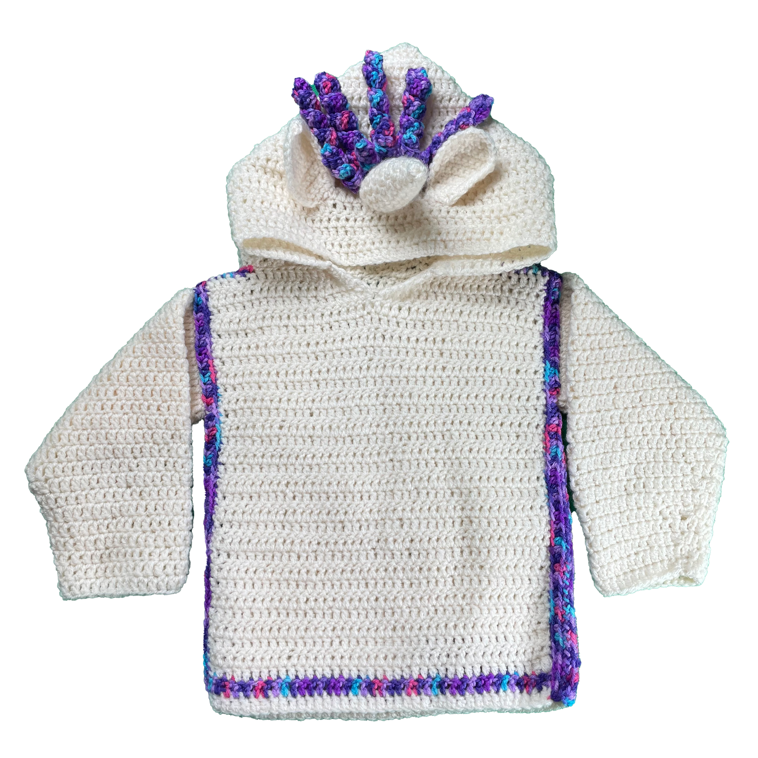 Handmade crocheted unicorn hoodie for 6 – 12 months old. Made to an original design by Lisa.